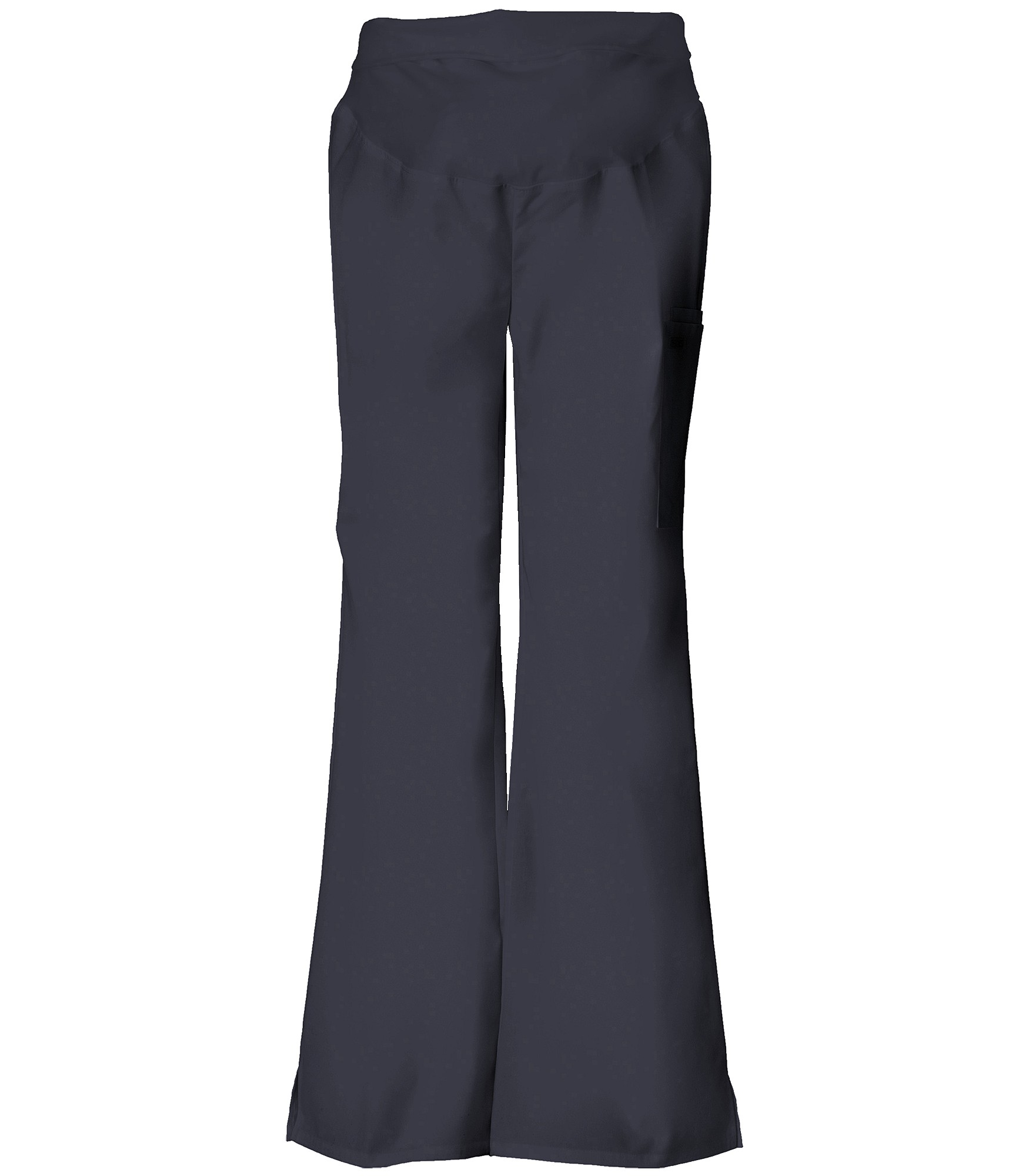This great fitting, adjustable rise, moderate flare leg maternity pant features a soft and stretchy tummy panel which grows with you. Double needle tonal topstitching edges the knit panel while double cargo pockets, back pocket and side vents finish the look.